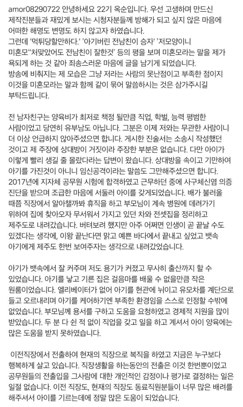 그녀는 자신이 방송에서 보여준 모습에 대해 해명하려고 하지는 않았지만, 전 남자친구와 관련된 거짓 정보와 미혼모를 공격하는 댓글을 보며 도저히 참을 수 없었다고 전했어요. 특히 "먹튀를 당할 만 했다"거나 "아기를 버린 전 남친이 승자"라는 등의 악플이 이어지자, 그녀는 더 이상 침묵할 수 없었다고 밝혔어요.