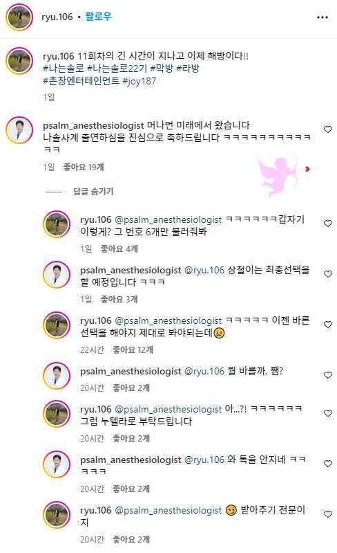 "22기 상철이는 최종선택을 할 예정입니다ㅋㅋㅋ"라고 댓글을 달자 상철은 "ㅋㅋㅋㅋ이젠 바른 선택을 해야지. 제대로봐야하는데"