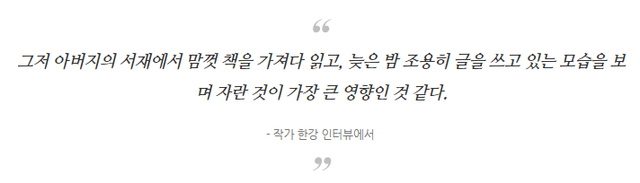 한강 작가는 아버지로부터 직접적인 가르침을 받지 않았지만, 부모님의 지지와 믿음이 그녀에게 큰 힘이 되었다고 말합니다. 부모님은 그녀가 가고자 하는 길을 응원해주었고, 이는 한강이 독자적인 문학 세계를 만들어 나가는 데 중요한 역할을 했습니다.