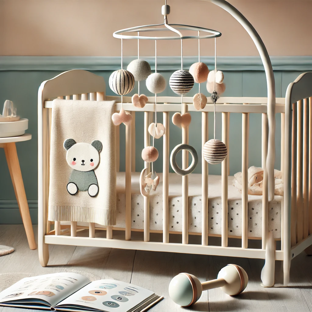 - 모빌: 흑백 대비 모빌을 아기 침대에 걸어 시각 자극 제공
