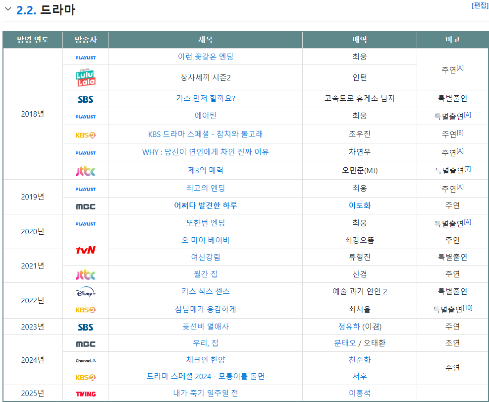 2021년에는 여신강림에도 특별출연 했었네요 그리고 MBC '어쩌다 발견한 하루', tvN '오 마이 베이비', JTBC '월간 집', SBS '꽃선비 열애사', MBC '우리, 집' 등에 출연했으며, 오는 12월 첫 방송을 앞둔 채널A '체크인 한양'에 천준화 역으로 출연 했고요