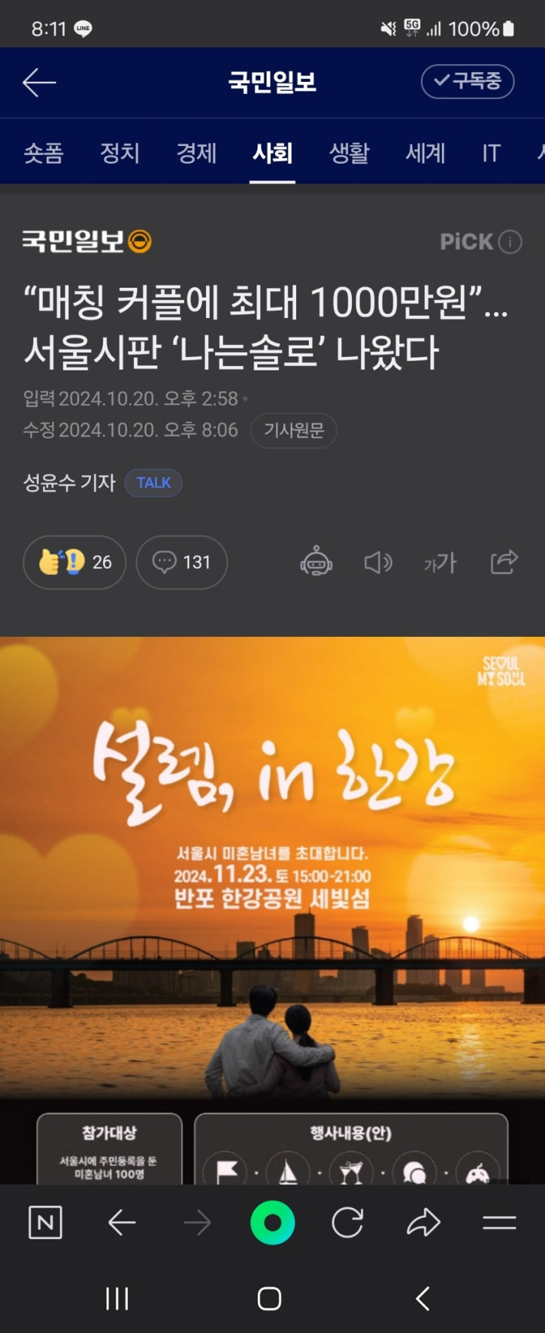 서울에 사는 미혼분이라면