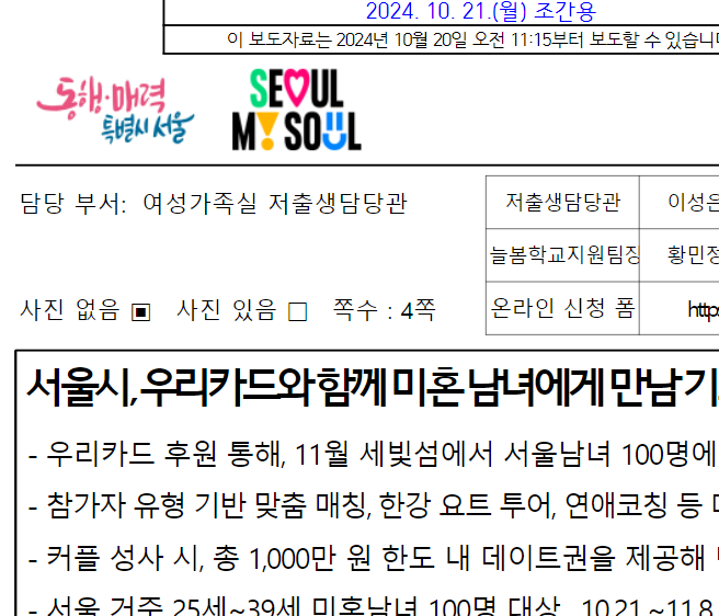 담당부서는 '서울시청 여성가족실 저출생담당관'으로