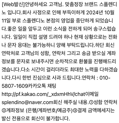 스플렌디노의 갑작스러운 폐업 소식은 많은 고객들에게 충격을 주었지만, 다행히 환불 절차가 진행 중이라는 점은 긍정적인 소식입니다. 이 과정이 원활히 마무리되기를 바라며, 고객들은 환불 요청 시 여유를 가지고 기다리는 것이 필요할 것입니다.