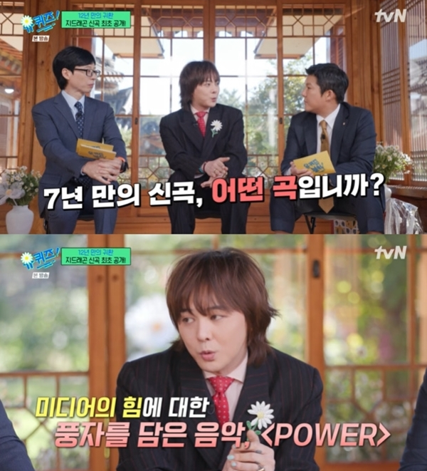 지드래곤은 "'유퀴즈' 방송이 나갈 때쯤이면 공개가 됐을 것 같은데 오랜만에 나오는데 디지털 싱글"이라며 "제목은 'POWER'다. 힘에 관한 노래인데 상대적이지 않나. 근력도 있고 체력도 있고 여러가지가 있는데 나한테 힘은 음악"이라고 말했다.