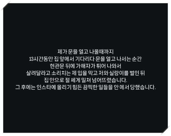 그녀의 말에 따르면, 괴한은 그녀의 집 앞에서 13시간 동안 기다리다 문이 열리는 순간 침입해 범행을 저질렀다고 해요.